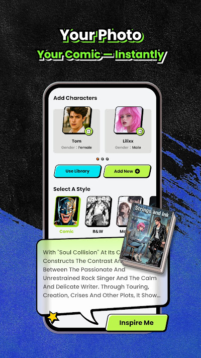The core feature is, of course, the AI art generator. You type in a prompt like “a grumpy orange cat staring at an empty food bowl,” pick a style (shonen, shojo, etc.), and it generates an image. I was impressed with the consistency; once I described my cat character, the AI kept him recognizable across different panels. The character customizer is basic but useful—I could tweak expressions and add little accessories like a bow tie, which was perfect for my silly story.